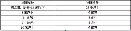 为了使检测器工作在最佳状下,线圈的电感量应保持在100uH-300uH之间。在线圈电感不变的情况下,线圈的匝数与周长有着重要关系。周长越小,匝数就越多。一般可参照: