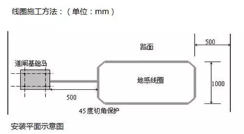 6.5 标准3米宽马路,车辆检测器线圈的尺寸为2米长1米宽,角上做45°、10厘米长的倒角。如下图:
